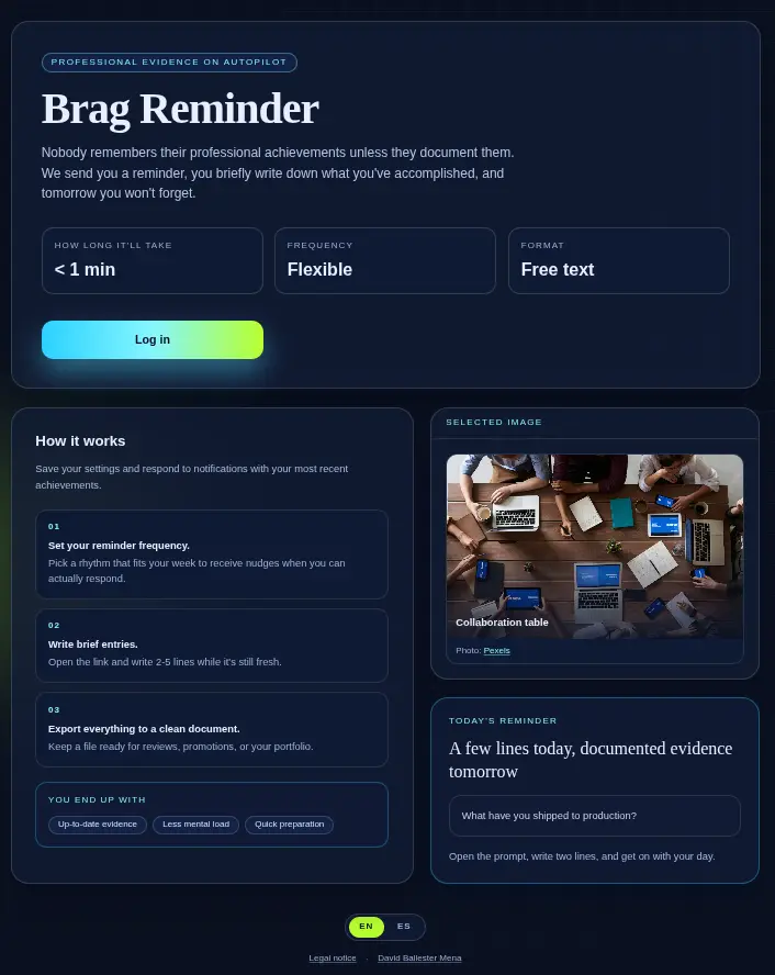 Capture your professional wins before they disappear. Set a reminder cadence, jot down entries from reminders, and export everything to a clean Markdown file when review season comes around.